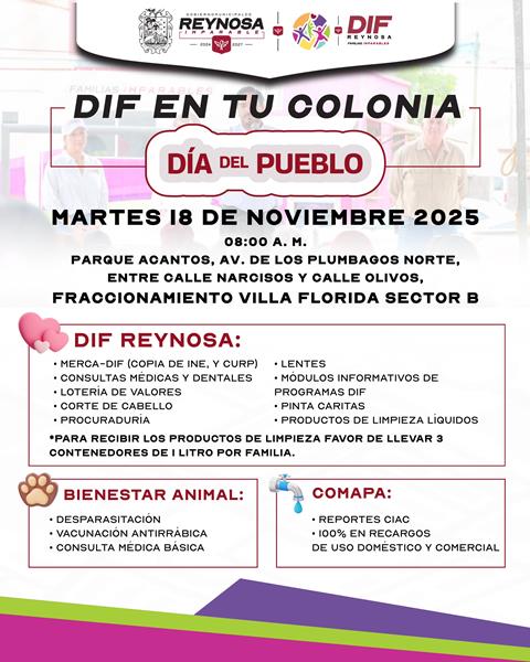 El Sistema DIF-Reynosa, reafirma con esta jornada su compromiso de acercar los servicios a las colonias y fortalecer el bienestar de la población, por lo que se invita a las familias a acudir y aprovechar los beneficios que se estarán ofreciendo.