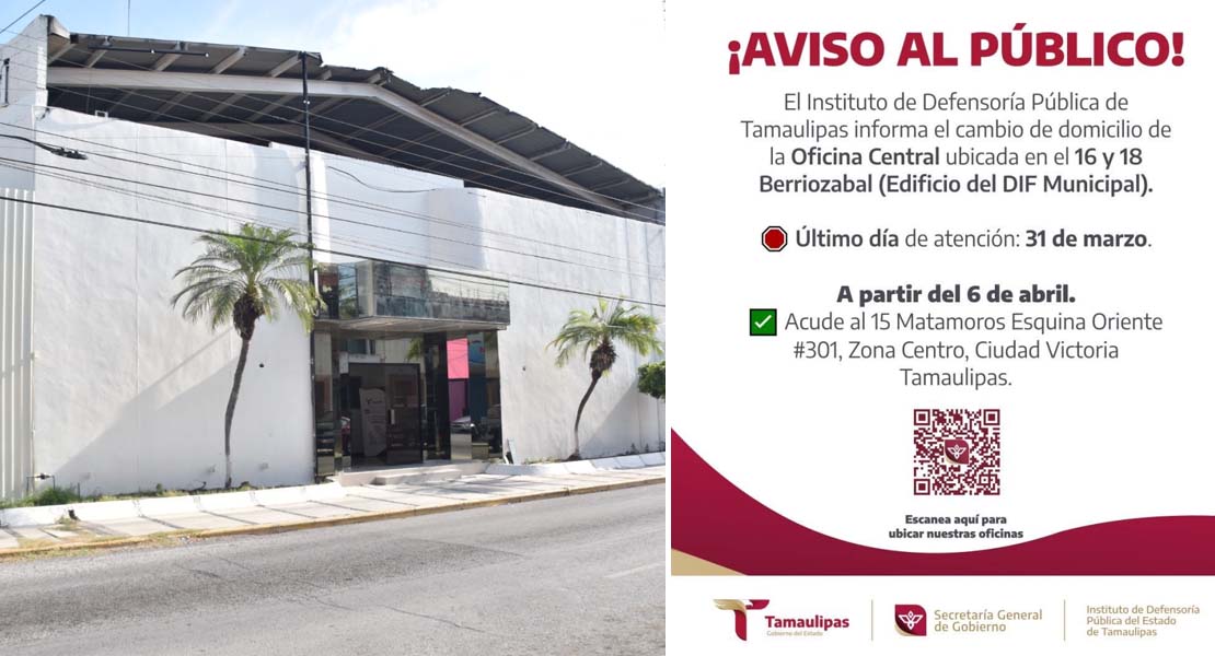 Ciudad Victoria, Tamaulipas.- El Instituto de Defensoría Pública del Estado de Tamaulipas informa a la ciudadanía sobre el cambio de domicilio de sus oficinas en Ciudad Victoria, con el objetivo de fortalecer la atención y mejorar los servicios jurídicos que se brindan a la población.