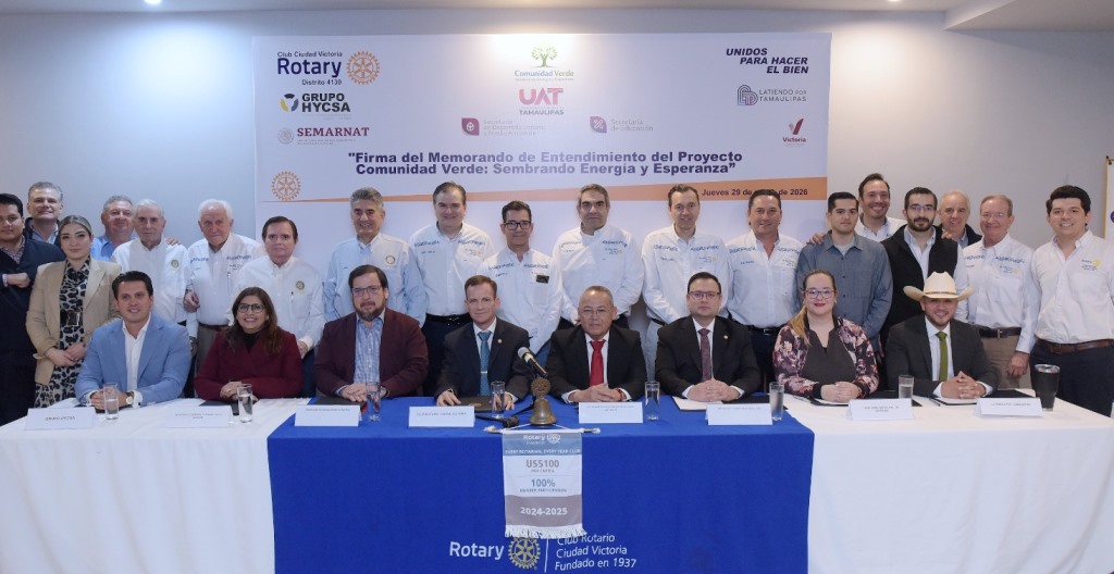 En ese marco, se llevó a cabo la firma del convenio de colaboración del proyecto Comunidad Verde, una alianza estratégica encabezada por el Club Rotary Ciudad Victoria, junto con la Secretaría de Desarrollo Urbano y Medio Ambiente (SEDUMA), la Secretaría de Educación de Tamaulipas (SET), la Universidad Autónoma de Tamaulipas (UAT), la SEMARNAT, el Gobierno municipal de Victoria, la asociación civil Latiendo por Tamaulipas y el Grupo HYCSA.