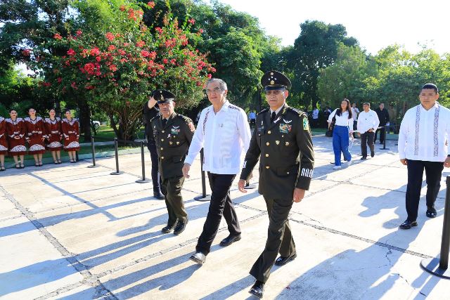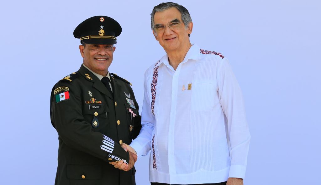 Ciudad Victoria, Tamaulipas.- El gobernador Américo Villarreal Anaya asistió como invitado de honor a la toma de posesión al cargo y protesta de bandera del general brigadier de Estado Mayor, Newton Manuel Chávez Baños, como comandante interino de la 48 Zona Militar.