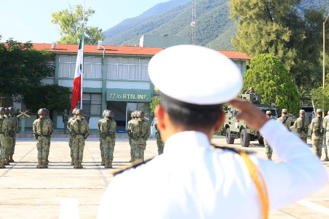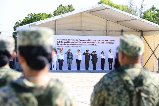 Durante la ceremonia celebrada la mañana de este lunes, en las instalaciones del 77 Batallón de Infantería, el general Juan José Gómez Ruiz, comandante de la 4ª Región Militar, dio cumplimiento a la orden de la presidenta de la República, Claudia Sheinbaum Pardo, y tomó la protesta al general Chávez Baños.