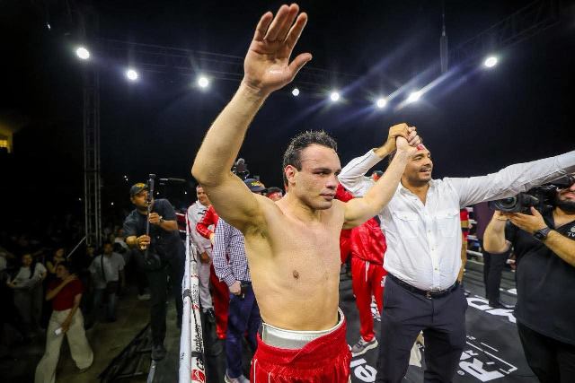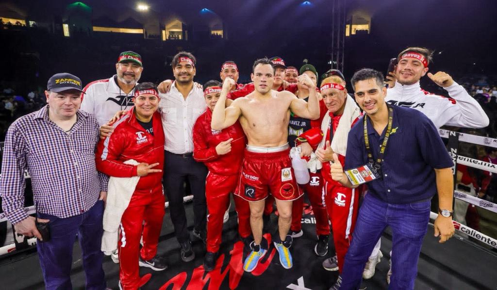 Reynosa, Tam.- El Presidente Municipal Carlos Peña Ortiz acompañado por el Campeón Mundial Julio César Chávez expresó al boxeador profesional Julio César Chávez Jr, su felicitación por el triunfo obtenido al derrotar en el ring, por nocaut técnico, al colombiano Jhon Caicedo, en el parque de beisbol Adolfo López Mateos que recibió a más de 10 Mil aficionados.