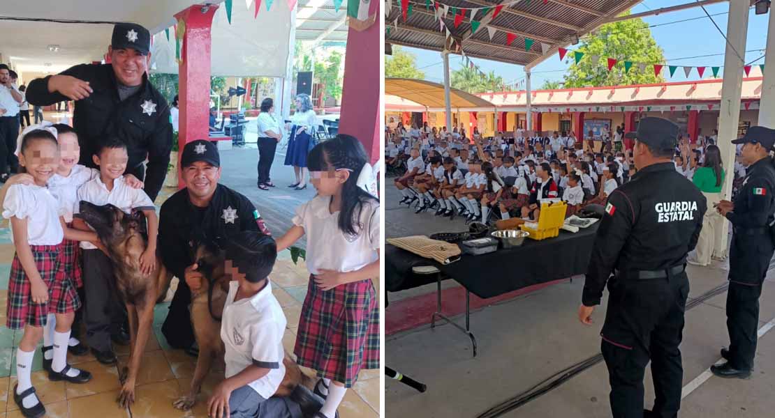 Ciudad Victoria, Tamaulipas.- El Agrupamiento Canino de la Guardia Estatal participó en la Academia Social de Valores y Jornada Cívica organizada en la Escuela Primaria Juana de Asbaje y Ramírez, en el centro de Ciudad Victoria, donde los binomios Brea y Lucky se convirtieron en el principal atractivo para alumnas, alumnos y docentes.