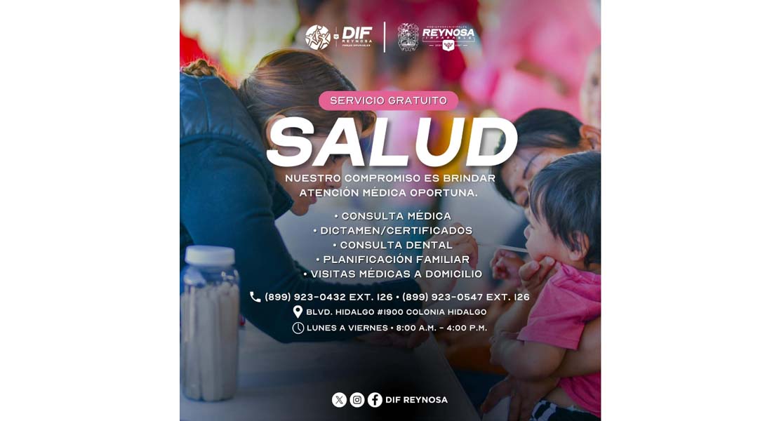 Reynosa, Tam.- El Sistema DIF-Reynosa que preside Carlos Luis Peña Garza, mantiene a disposición de la población diversos servicios gratuitos de salud, con el objetivo de garantizar atención médica oportuna y contribuir al bienestar integral de las familias.