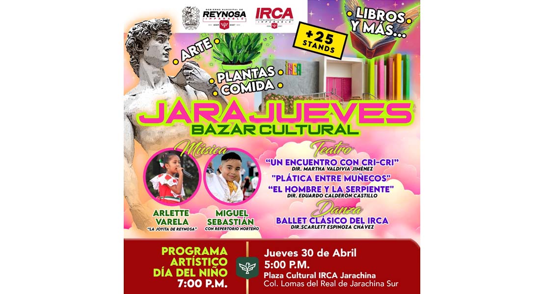 Reynosa, Tam.- El Gobierno de Reynosa, que preside el Alcalde Carlos Peña Ortiz, invita a festejar el Día del Niño este 30 de abril en una edición especial del Jarajueves en la Plaza Cultural IRCA Jarachina, en la colonia Lomas del Real de Jarachina Sur.