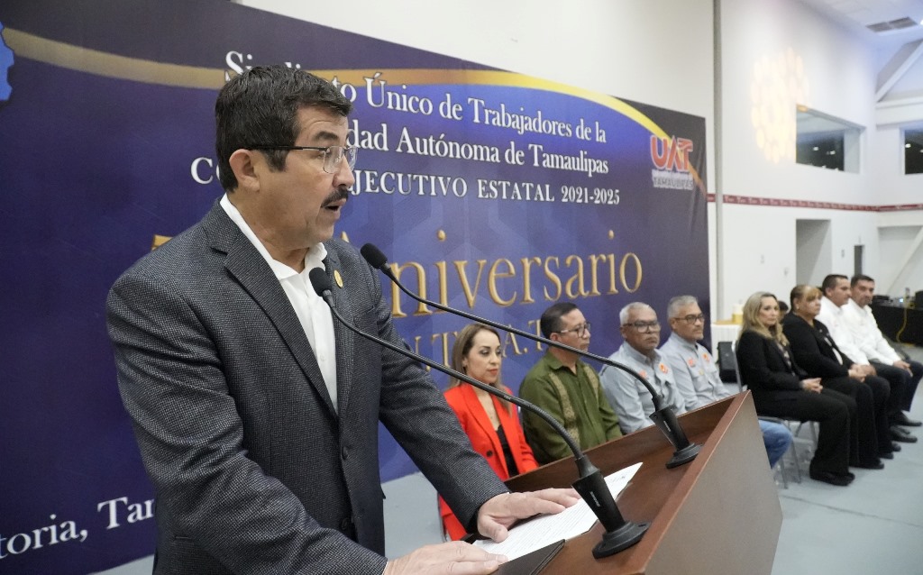 En su mensaje, destacó que, a más de cinco décadas, esta organización sindical ha sido parte esencial del crecimiento, la estabilidad y la fortaleza de la Universidad, subrayando que este encuentro no solo es una celebración, sino un reconocimiento al esfuerzo constante que hace posible que la UAT siga siendo un orgullo para todo el estado de Tamaulipas.