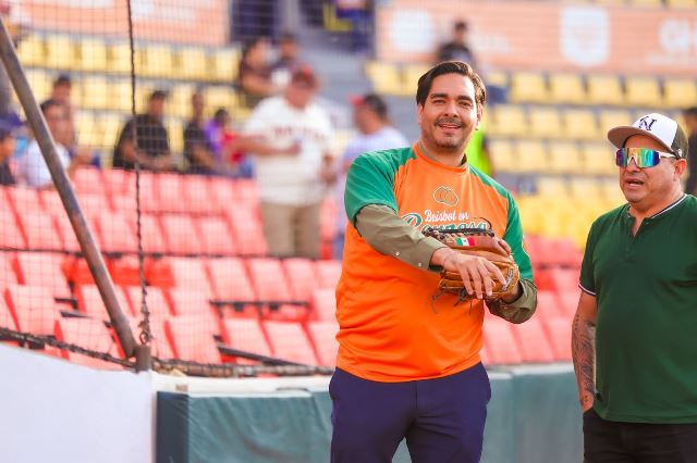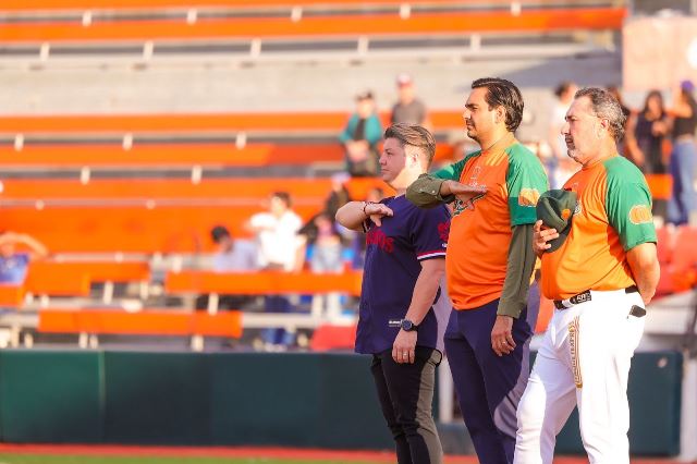 Reynosa, Tam.- ¡Playbooool! El diamante verde del parque Adolfo López Mateos volvió a hacer eco en sus jardines al lanzar el Presidente Municipal Carlos Peña Ortiz la primera bola del encuentro de la Selección de Reynosa contra los Rieleros de Aguascalientes, conmemorando el 277 Aniversario de la Fundación de Reynosa.