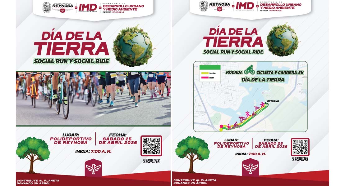 Reynosa, Tam.- El Alcalde Carlos Peña Ortiz, te convoca a formar parte de la conmemoración del Día de la Tierra, Social Run y Social Ride con una Carrera 5K y una Rodada Ciclista, este sábado 25 de abril, asiste al malecón de la laguna La Escondida, a un costado del Polideportivo Reynosa a partir de las 7:00 de la mañana.