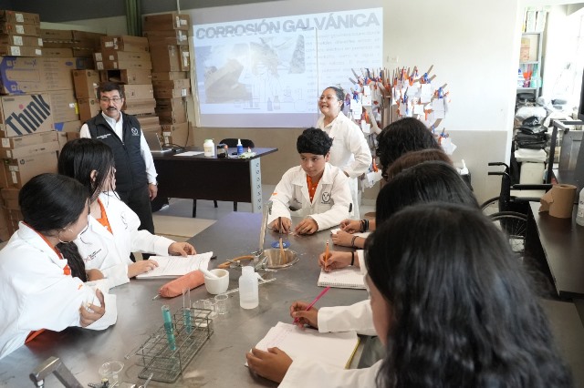 En otro punto del recorrido, sostuvo un diálogo cercano con el personal docente que participa en el curso de homologación de Unidades de Enseñanza-Aprendizaje, quienes compartieron sus experiencias y reflexiones sobre los procesos de enseñanza en el nivel medio superior. Asimismo, visitó las aulas, el laboratorio de ciencias, estands de emprendimiento estudiantil y diferentes espacios del plantel, donde convivió con alumnos destacados, reconociendo su entusiasmo, talento y compromiso con la comunidad universitaria.