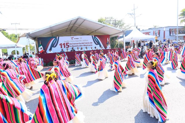 En un marco lleno de folclor, música tradicional mexicana, majestuosos vestuarios y mucho colorido, con representaciones de los caudillos revolucionarios, bailables y tablas gimnásticas, también desfilaron a lo largo del bulevar Tamaulipas 255 integrantes del Ejército Mexicano, Fuerza Aérea y Guardia Nacional, y 724 elementos de la Guardia Estatal, haciendo un total de más de 3,500 participantes.