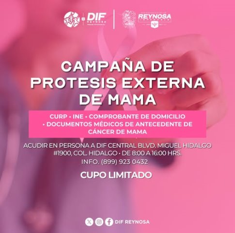 Reynosa, Tam.- Como parte de la campaña rosa que se realizará en el mes de octubre, el Sistema DIF-Reynosa que preside Carlos Luis Peña Garza, invita a todas las mujeres que han enfrentado con valentía el cáncer de mama a sumarse a la Campaña de Prótesis Externa de Mama.