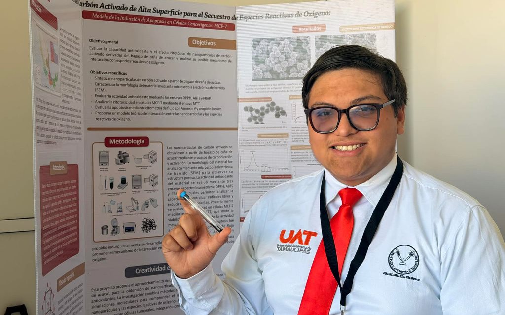 El alumno de la Escuela Preparatoria Mante de la UAT presentó con éxito su proyecto enfocado en la síntesis de nanopartículas de carbón activado, una línea de investigación aplicada al estudio de procesos asociados al cáncer.