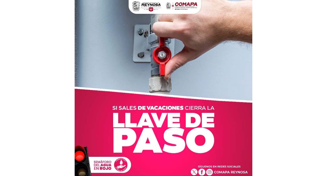 Reynosa, Tam.- Con el objetivo de fomentar la cultura del cuidado del agua y prevenir incidentes en los hogares, la Comisión Municipal de Agua Potable y Alcantarillado de Reynosa exhorta a los usuarios que saldrán de la ciudad en este periodo vacacional a cerrar la llave de paso de sus domicilios.