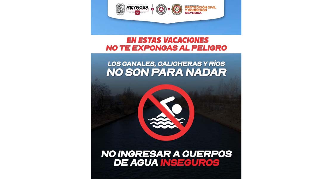Reynosa, Tam.- El Gobierno Municipal de Reynosa hace un importante recordatorio a la comunidad, a evitar introducirse en canales, drenes, ríos y calicheras; especialmente en el río Bravo, pues no son aptos para su esparcimiento por cuestión de seguridad e higiene.