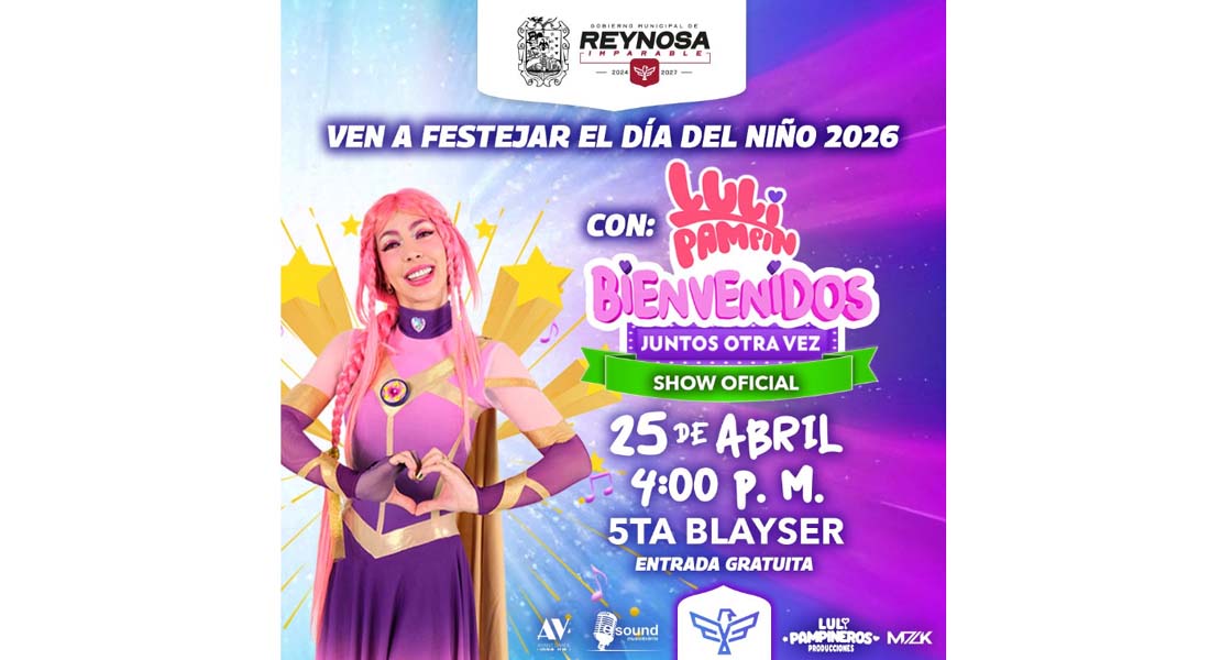 Reynosa, Tam.- Tienes que celebrar el Día del Niño 2026; el Alcalde Carlos Peña Ortiz invita a las familias de Reynosa a disfrutar el Show de Luli Pampin, Bienvenidos, Juntos Otra Vez, este 25 de abril con un gran espectáculo lleno de música, diversión y alegría en la Quinta Blayser desde las 4:00 de la tarde.