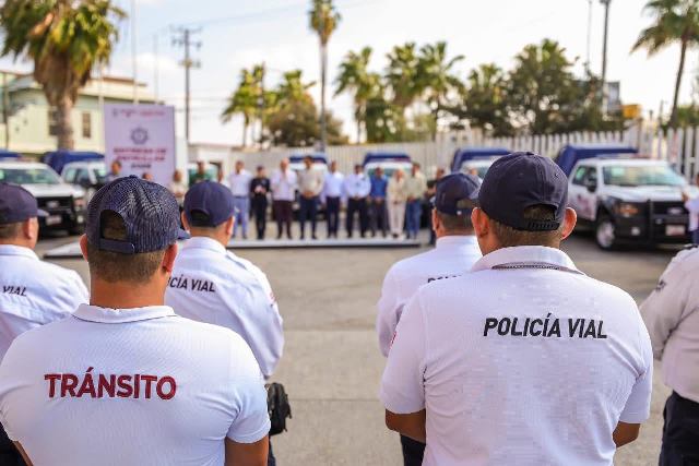 El Alcalde entregó las llaves de las nuevas unidades al Secretario de Seguridad Pública, Tránsito y Vialidad Municipal, Geovanni Barrios Moreno, quien estuvo acompañado por la Directora de Tránsito Iris Alondra Chavira Ríos y los elementos de la corporación, así como funcionarios municipales y miembros del Cabildo local.