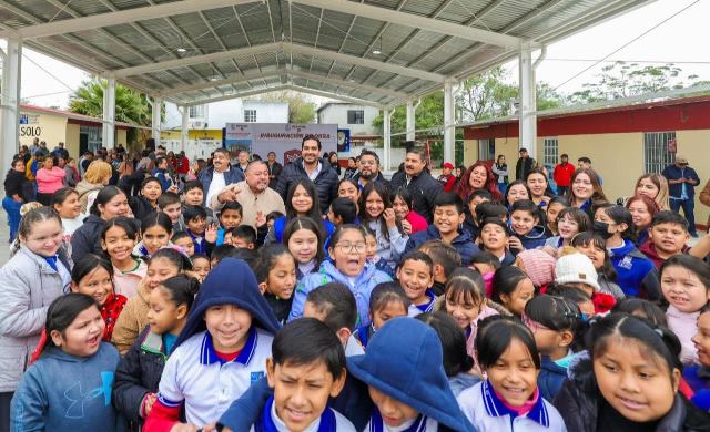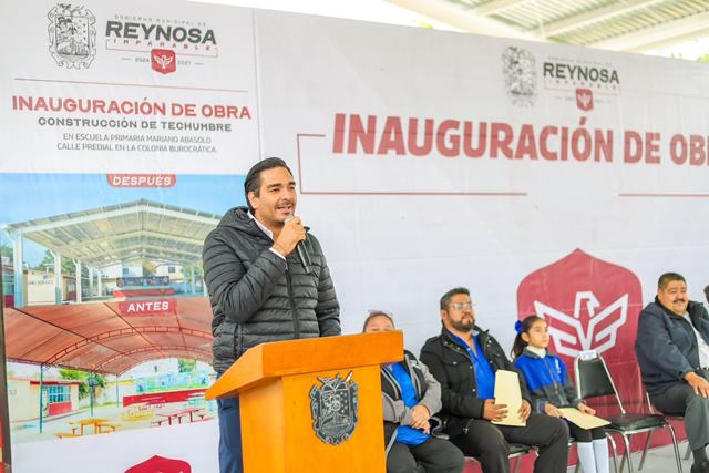 Reynosa, Tam.- Un impulso más para fortalecer la educación en Reynosa, fue materializado por el Alcalde Carlos Peña Ortiz, al entregar una techumbre metálica de 400 metros cuadrados a la comunidad escolar de la primaria Mariano Abasolo, que dirige Javier Abdiel Valdiviezo Salazar, quien estuvo acompañado por la niña Camila Yired Altamirano Moreno, alumna de sexto grado.