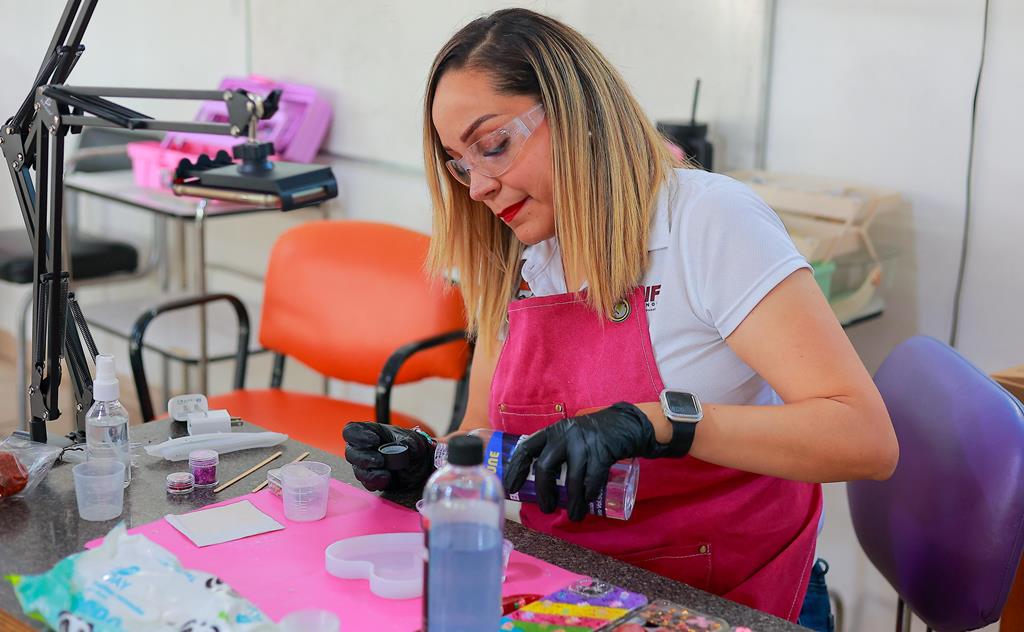 Entre las opciones formativas se encuentra el taller de resina epóxica, una alternativa que permite a las participantes transformar su talento en oportunidades de emprendimiento, generando productos creativos como llaveros, fundas para celulares, plumas, aretes, collares, anillos y más, que con la capacitación pueden ir mejorando la técnica y creando más productos.