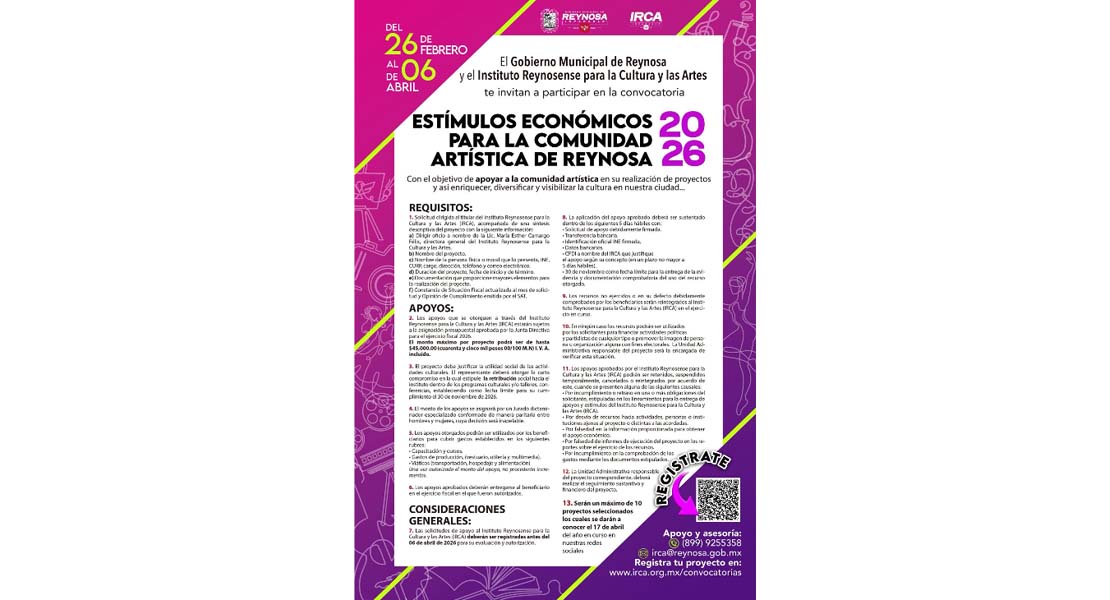 Reynosa, Tam.- El Gobierno de Reynosa, que preside el Alcalde Carlos Peña Ortiz, invita a la comunidad artística a participar en la Convocatoria de Estímulos Económicos 2026 lanzada por el Instituto Reynosense para la Cultura y las Artes.