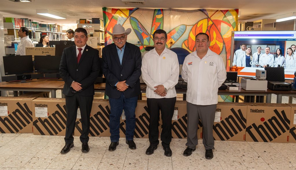 De manera complementaria, el rector hizo entrega de equipo tecnológico que incluye 13 cámaras tipo Policom para videoconferencia, 15 equipos de cómputo de escritorio, así como pantallas que permitirán modernizar los procesos de enseñanza mediante entornos digitales interactivos.