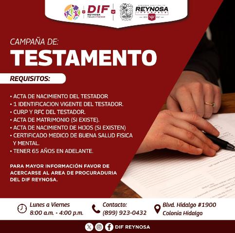 Reynosa, Tam.- El Sistema DIF-Reynosa que preside Carlos Luis Peña Garza y el Voluntariado que encabeza Alejandra Yelitza Garza, invitan a la población de 65 años en adelante a participar en la Campaña de Testamento, una iniciativa que busca promover la cultura de la previsión y fortalecer la seguridad jurídica de las familias.