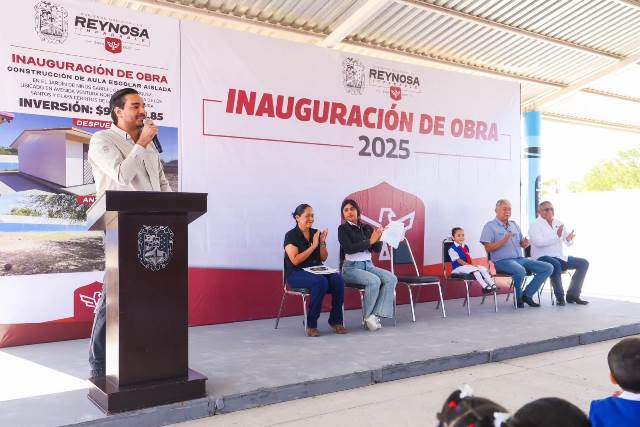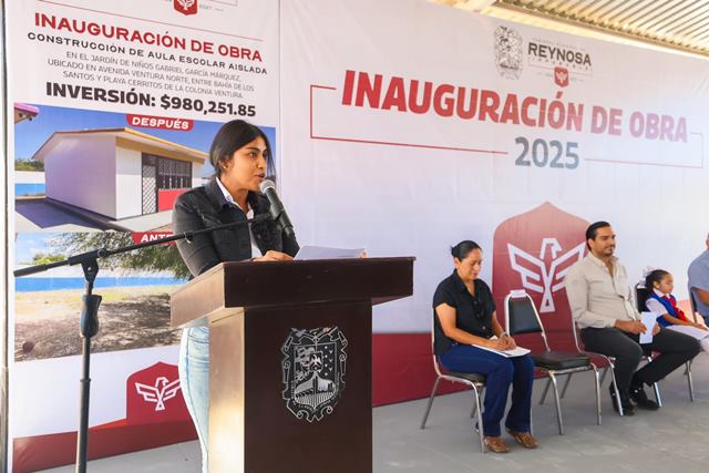 Reynosa, Tam.- La Maestra Vilma Patricia Martínez Tavares, Encargada del jardín de niños Gabriel García Márquez, recibió al Presidente Municipal Carlos Peña Ortiz, «hoy es un día muy especial para nuestra comunidad escolar ya que celebramos la entrega de una nueva Aula, que representa crecimiento, oportunidad y esperanza para nuestros alumnos».