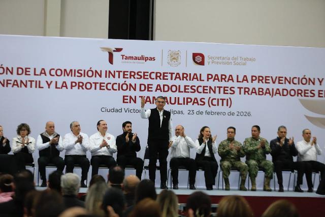 Durante la ceremonia cívica de honores en el Polyforum de esta capital, el gobernador, junto con el secretario del Trabajo, Gerardo Illoldi, y el titular de la Oficina de la Representación Federal del Trabajo en Tamaulipas, Iván Karim Rocha Picazo, firmó el acuerdo que da marco legal y sustento a esta comisión, que representa un mecanismo permanente de coordinación entre dependencias estatales, sectores sociales y la iniciativa privada para atender de manera integral el fenómeno del trabajo infantil, desde un enfoque de derechos humanos y bajo el principio del interés superior de la niñez.