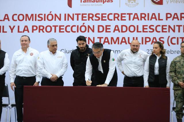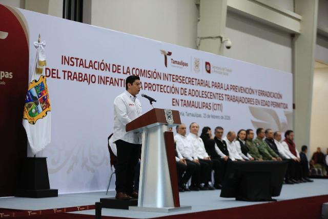 Durante la ceremonia cívica de honores en el Polyforum de esta capital, el gobernador, junto con el secretario del Trabajo, Gerardo Illoldi, y el titular de la Oficina de la Representación Federal del Trabajo en Tamaulipas, Iván Karim Rocha Picazo, firmó el acuerdo que da marco legal y sustento a esta comisión, que representa un mecanismo permanente de coordinación entre dependencias estatales, sectores sociales y la iniciativa privada para atender de manera integral el fenómeno del trabajo infantil, desde un enfoque de derechos humanos y bajo el principio del interés superior de la niñez.