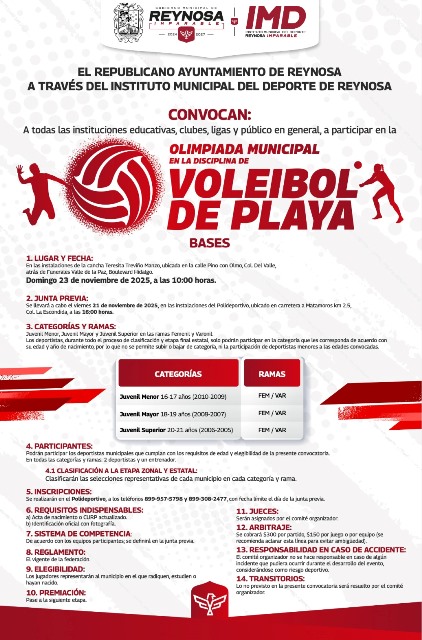 Reynosa, Tam.- El Alcalde Carlos Peña Ortiz invita a todas las instituciones educativas, clubes, ligas y público en general a participar en la Olimpiada Municipal en la disciplina de Voleibol de Playa, rumbo a la Olimpiada Nacional CONADE 2026, organizada a través del Instituto Municipal del Deporte.