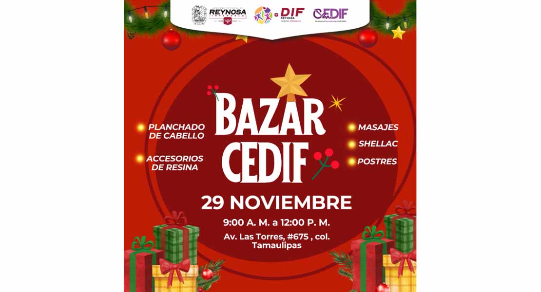 Reynosa, Tam.- Con el objetivo de promover el desarrollo de habilidades y fomentar el crecimiento económico familiar, el Sistema DIF-Reynosa que preside Carlos Luis Peña Garza, invita a la ciudadanía al Bazar CEDIF, que se llevará a cabo este sábado 29 de noviembre en las instalaciones del CEDIF Las Torres, donde alumnas y alumnos presentarán los conocimientos adquiridos en sus diferentes talleres.