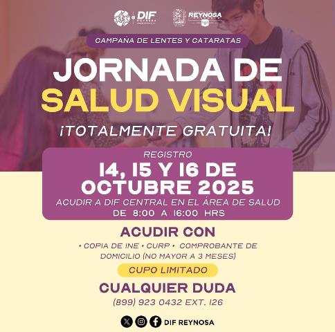 Reynosa, Tam.- Con el objetivo de seguir mejorando la salud visual de la población más vulnerable, el Sistema DIF-Reynosa que preside Carlos Luis Peña Garza, convoca a la ciudadanía a participar en la Jornada de Salud Visual, para beneficiar a las familias con revisión de la vista, lentes y operaciones de Cataratas, donde médicos especialistas del Hospital La Carlota de Montemorelos, Nuevo León ofrecerán valoraciones oftalmológicas totalmente gratuitas.