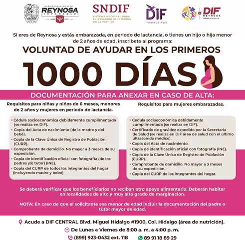Reynosa, Tam.- Con el propósito de continuar impulsando el bienestar de las familias y apoyar a mujeres embarazadas, así como a niñas y niños en sus primeros años de vida, el Sistema DIF-Reynosa invita a inscribirse al programa “Voluntad de Ayudar en los Primeros 1000 Días”, una iniciativa que promueve la buena nutrición y el desarrollo saludable durante las etapas más importantes de crecimiento.