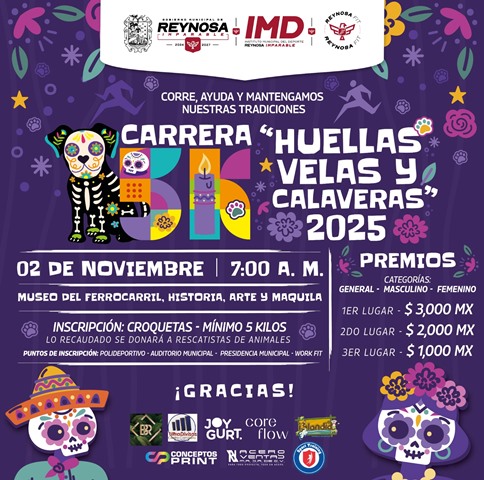 Reynosa, Tam.- El Alcalde Carlos Peña Ortiz, invita a la ciudadanía a participar en la carrera 5K con causa Huellas, Velas y Calaveras 2025, que se llevará a cabo el próximo 2 de noviembre a las 7:00 de la mañana, partiendo del Museo del Ferrocarril, Arte y Maquila.