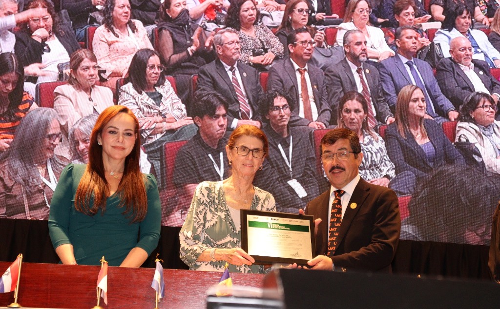 Al término de su exposición, el rector Dámaso Anaya entregó un reconocimiento institucional a la Dra. Pardo por su destacada trayectoria y por su aportación al fortalecimiento de la comunidad científica iberoamericana.