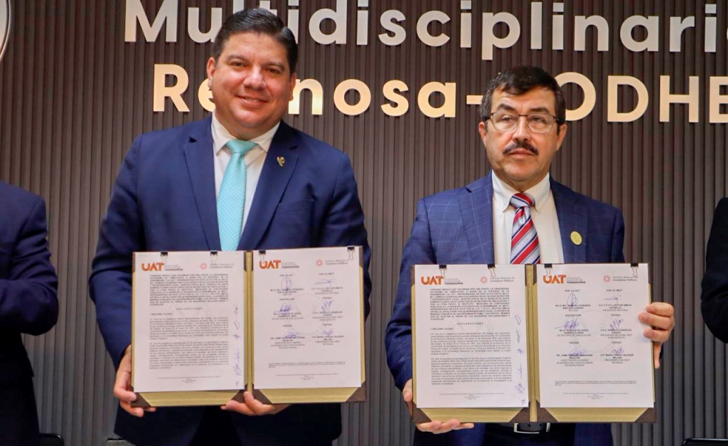Reynosa, Tam.- El rector de la Universidad Autónoma de Tamaulipas (UAT), Dámaso Anaya Alvarado, y el presidente del Instituto Mexicano de Contadores Públicos (IMCP), Héctor Amaya Estrella, firmaron un Convenio Marco de Colaboración que impulsará proyectos conjuntos orientados a fortalecer la formación de las y los futuros profesionales de la contaduría.