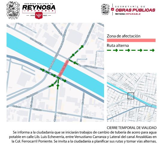 Reynosa, Tam.- El Gobierno Municipal y la COMAPA de Reynosa informan que el próximo lunes 13 de octubre se iniciarán el trabajo de cambio de tubería de acero para agua potable en el libramiento Luis Echeverría, entre Venustiano Carranza y lateral del canal Anzaldúas, en la colonia Ferrocarril Poniente.