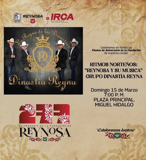 Reynosa, Tam.- El Presidente Municipal Carlos Peña Ortiz invita a la población de la región a disfrutar del arte y la cultura en la conmemoración del 277 Aniversario de la Fundación de Reynosa, en las plazas Miguel Hidalgo y Treviño Zapata, hoy domingo 15 de marzo.