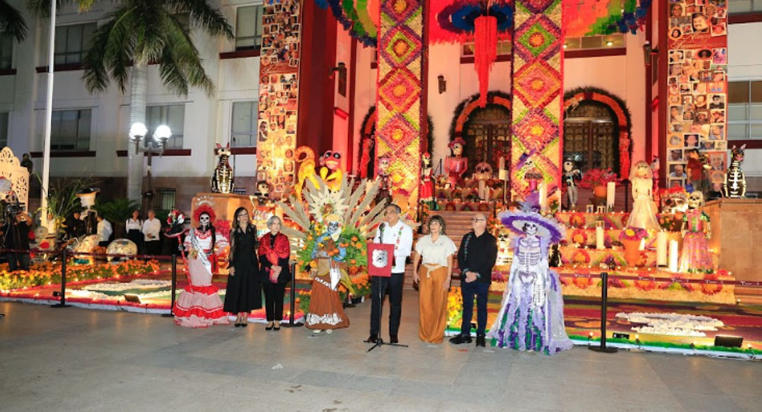 Este año el altar monumental elaborado por artesanos tamaulipecos que se ubica en las escalinatas de Palacio de Gobierno luce gigantescas figuras de catrinas, alebrijes, tapetes multicolores, flor de cempasúchil y cientos de imágenes de tamaulipecos y tamaulipecas que ya no están entre nosotros, las cuales fueron enviadas por sus familiares.