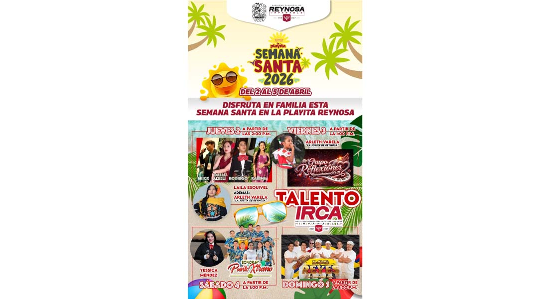 Reynosa, Tam.- El Gobierno de Reynosa, que preside el Alcalde Carlos Peña Ortiz, invita a disfrutar de la oferta musical que el Instituto Reynosense para la Cultura y las Artes presentará en «La Playita» del 2 al 5 de abril en el marco de la Semana Santa.