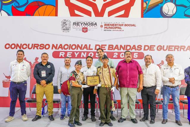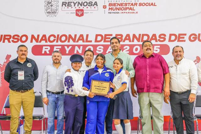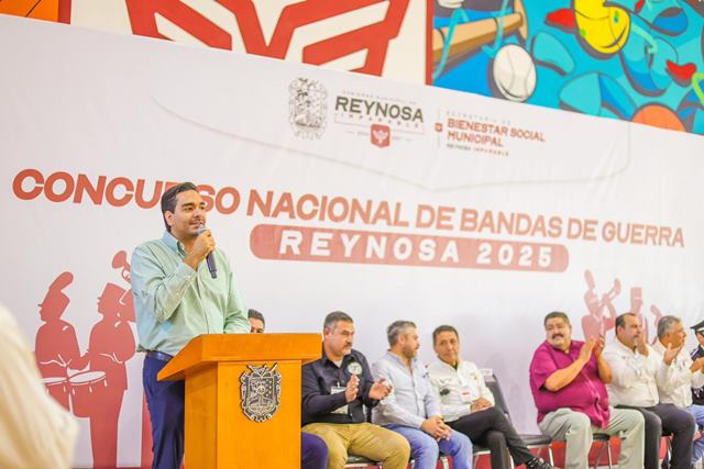 Reynosa, Tam.- El Alcalde Carlos Peña Ortiz presidió el Concurso Nacional de Bandas de Guerra 2025, celebrado en esta ciudad, con la presencia de Moisés Salas Ortega, presidente de la Federación Mexicana de Bandas de Guerra y la participación de equipos en categorías Primaria, Secundaria, Bachillerato y Libre.