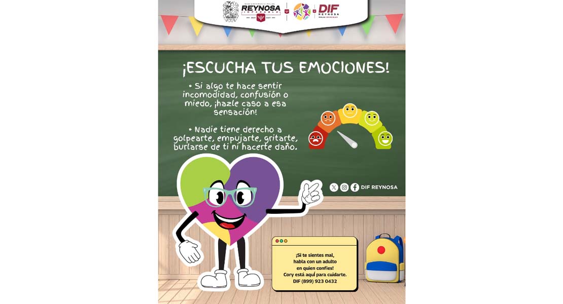 Reynosa, Tam.- El Sistema DIF-Reynosa que preside Carlos Luis Peña Garza, impulsa la campaña de prevención y cuidado de la niñez a través de «Cory», que hace un llamado a niñas y niños a reconocer la importancia de sus emociones y a expresarlas, como parte fundamental de su bienestar y desarrollo integral.