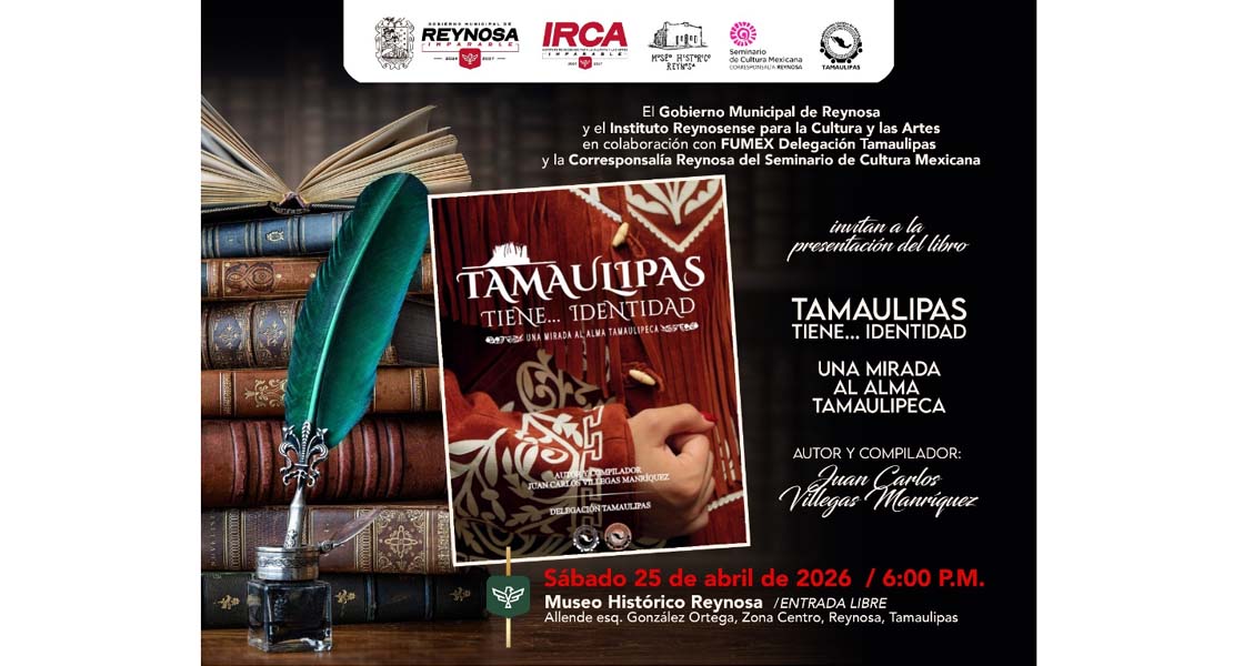 Reynosa, Tam.- El Gobierno de Reynosa, que preside el Alcalde Carlos Peña Ortiz, invita este sábado 25 de abril a la presentación del libro «Tamaulipas tiene… identidad: Una mirada al alma tamaulipeca», autoría del escritor y compilador Juan Carlos Villegas Manríquez.