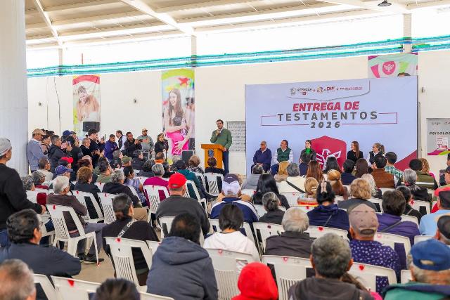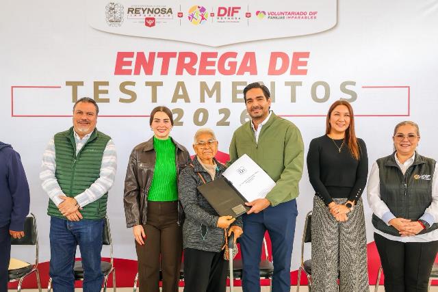 Reynosa, Tam.- El Alcalde Carlos Peña Ortiz presidió este lunes 23 de febrero la ceremonia de Entrega de Testamentos 2026 que benefició a 55 adultos mayores de 65 años, siendo acompañado por su esposa, la Presidenta del Voluntariado DIF-Reynosa, Alejandra Yelitza Garza, impulsora de la iniciativa.