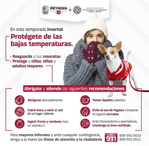 La Coordinación de Protección Civil y Bomberos, la Dirección de Salud y Grupos Vulnerables y la Dirección de Control y Bienestar Animal recomiendan protegerse de las bajas temperaturas, no exponer a niños, personas enfermas o con discapacidad, adultos mayores y mascotas al riesgo del frío y de cambios bruscos de temperatura.