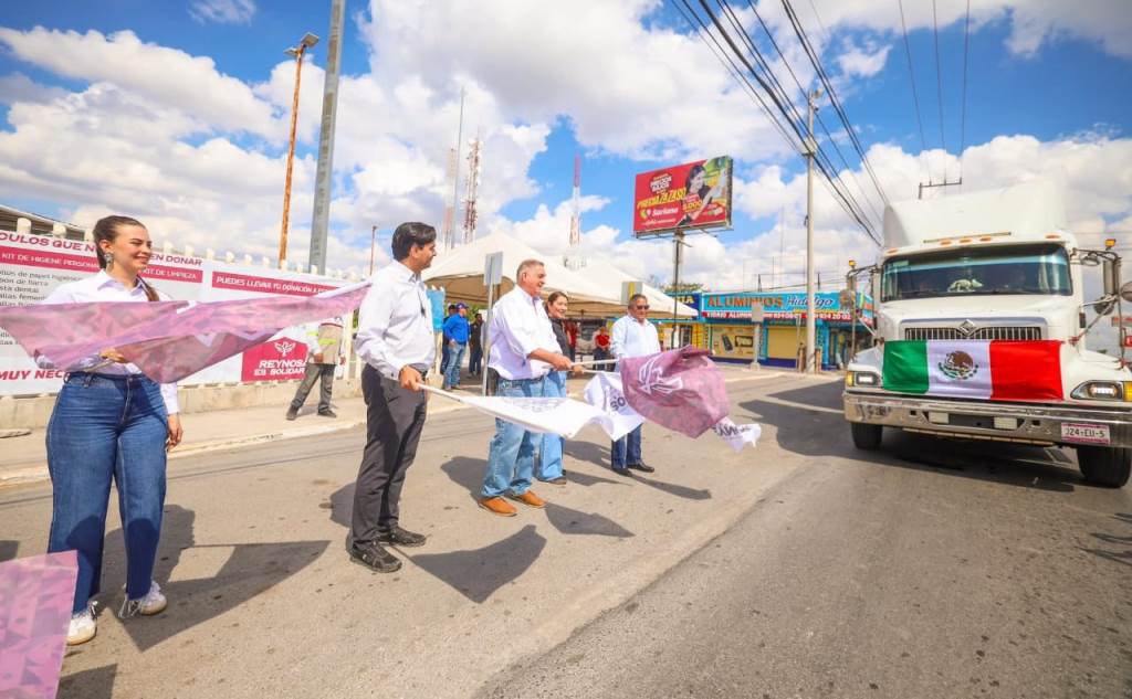 En el banderazo de salida, las unidades de carga pesada fueron despedidas por el Presidente del Patronato del DIF-Reynosa, Carlos Luis Peña Garza y la Presidenta del Voluntariado del organismo, Alejandra Yelitza Garza, quienes acompañaron al Alcalde en esta puesta en marcha.