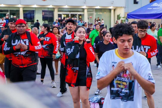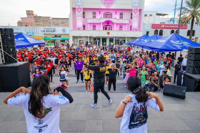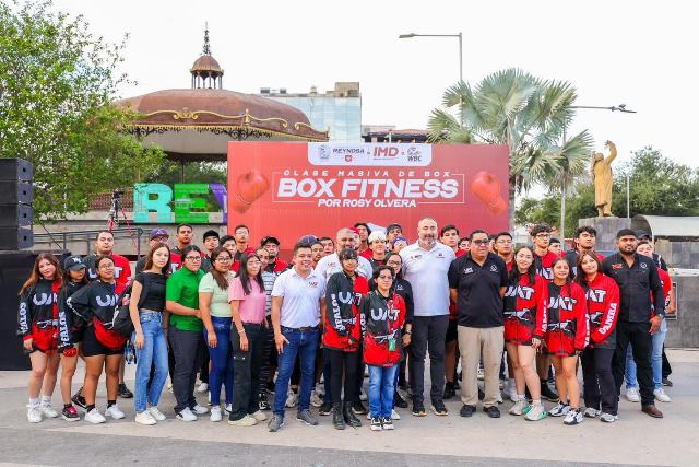 Reynosa, Tam.- Disfrutaron cientos de reynosenses una cátedra de Box Fitness que el Alcalde Carlos Peña Ortiz, puso a disposición de la población, impartida en la plaza principal Miguel Hidalgo, por Rosy Olvera, entrenadora del WBC, Consejo Mundial de Boxeo.