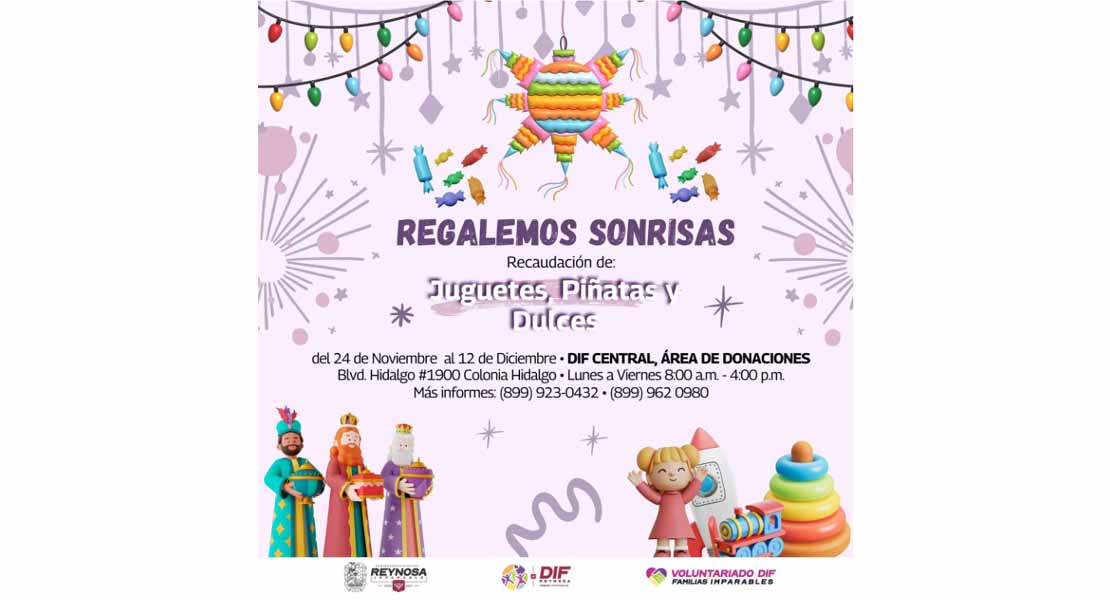 Reynosa, Tam.- El Alcalde Carlos Peña Ortiz te invita a colaborar en la recaudación de Juguetes, Piñatas y Dulces, los cuales se harán llegar a los niños en condición vulnerable mediante la campaña del Voluntariado DIF que preside Alejandra Yelitza Garza, «Regalemos Sonrisas», que recibirá sus donativos hasta el día 12 de diciembre en el DIF Central, ubicado en bulevar Hidalgo # 1900 de la colonia Hidalgo.