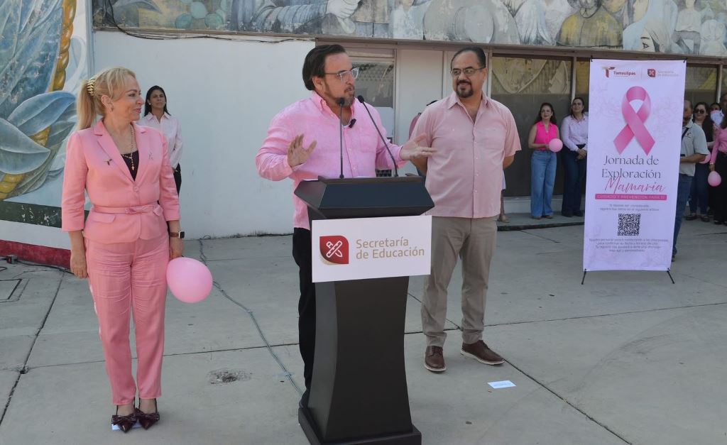 Ciudad Victoria, Tamaulipas.- Mujeres y hombres que forman parte del sector educativo en el estado, así como docentes y estudiantes, se sumaron a las actividades realizadas por la Secretaría de Educación de Tamaulipas (SET) en el marco de octubre, Mes de la Concientización sobre el Cáncer de Mama.