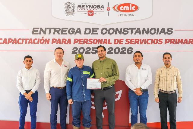 Reynosa, Tam.- El Presidente Municipal Carlos Peña Ortiz entregó los reconocimientos que trabajadores de Servicios Públicos del R. Ayuntamiento obtuvieron al aprobar los cursos de capacitación impartidos por la Cámara Mexicana de la Industria de la Construcción, CMIC, que preside Roberto Aviles Arizpe.